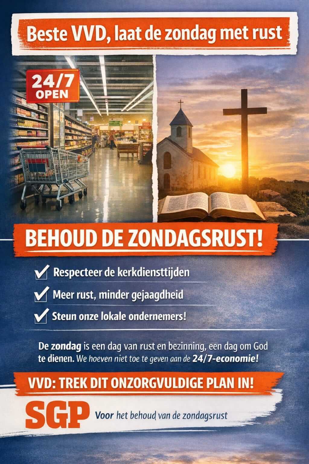 Een week voor de verkiezingen publiceert de VVD eenzijdig een voorstel om de openstelling van winkels op zondag nóg verder te verruimen dan al het geval is. Aanleiding is de wens van supermarkten. Aan andere ondernemers en inwoners is nog niets gevraagd. De SGP vindt dit onzorgvuldig, overhaast en niet getuigen van respect voor het bijzondere karakter van de zondag. Ook wordt geen rekening gehouden met de tijden waarop kerkdiensten plaatsvinden.